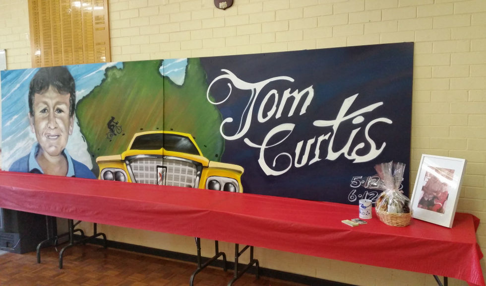 As arranged, Michael Barker created a large painting depicting Tom Curtis and his yellow ‘R’ Series Valiant. Michael erected the painting inside the hall whilst we were all on the run. Full credit to Michael for having it ready on time.